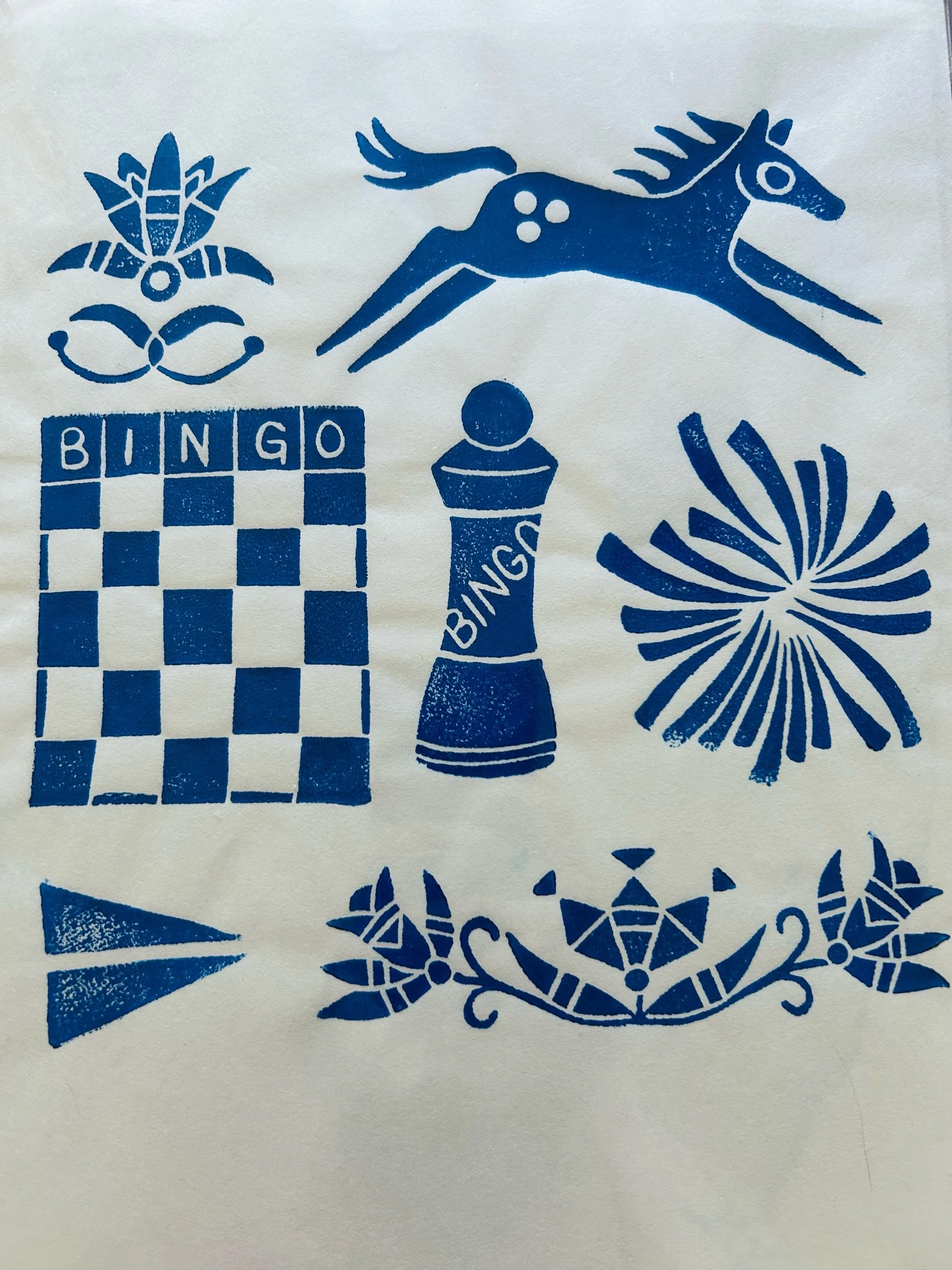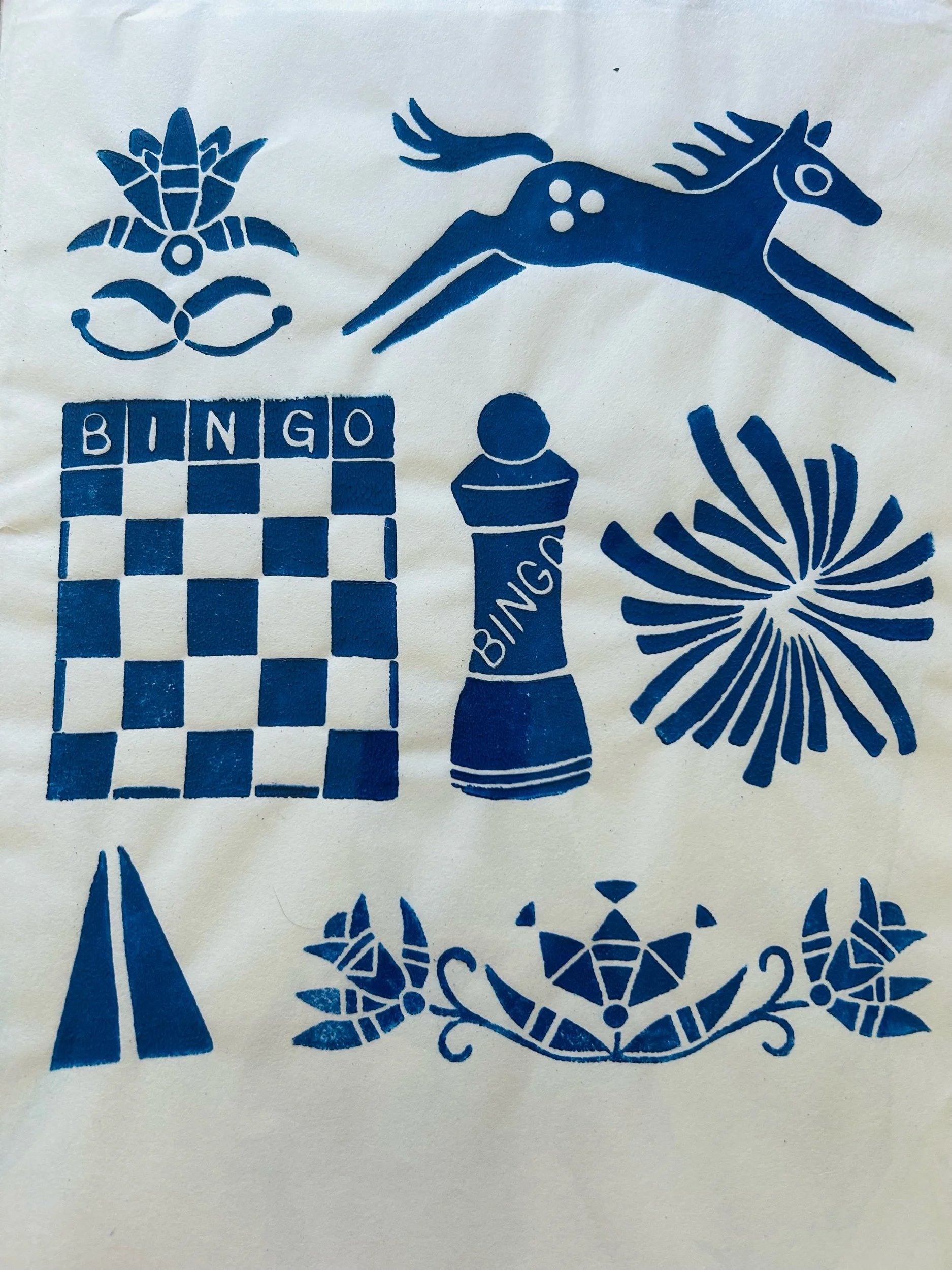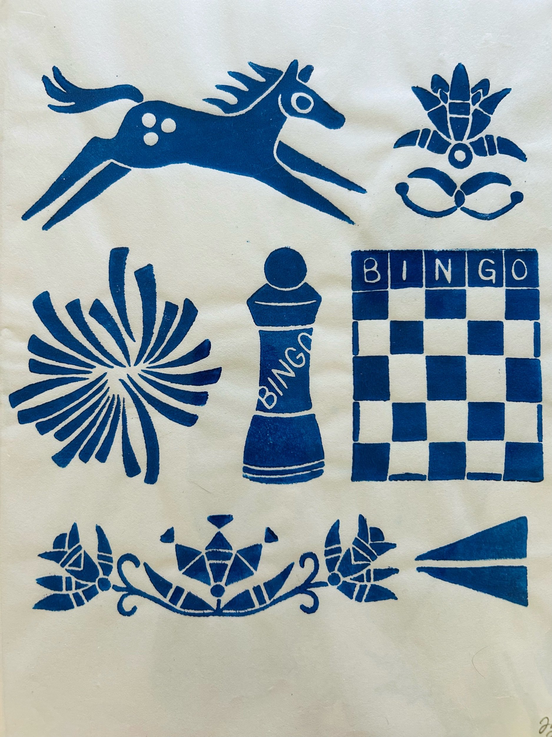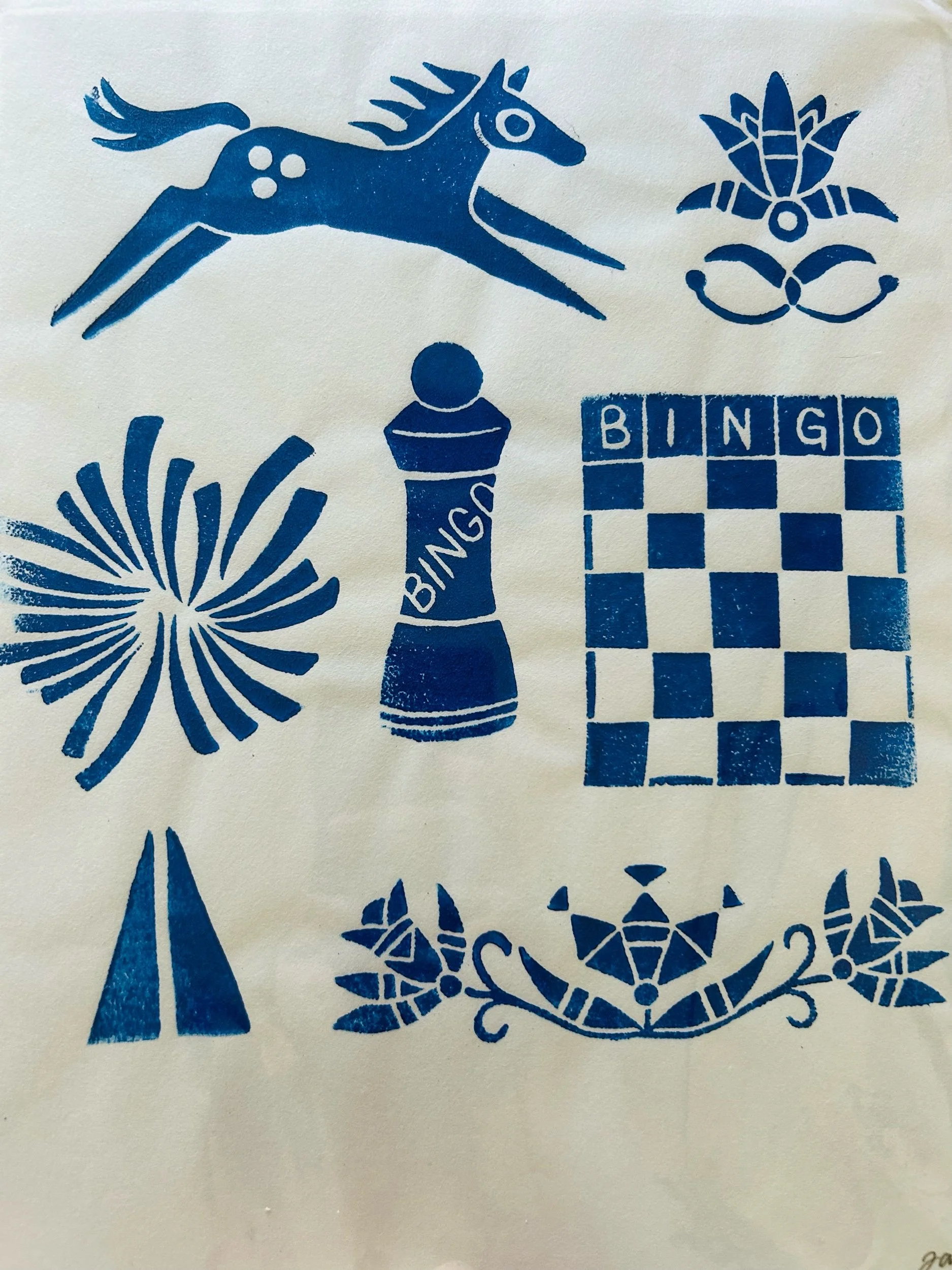 Limited edition block print on blue Japanese art paper, 9in by 12in