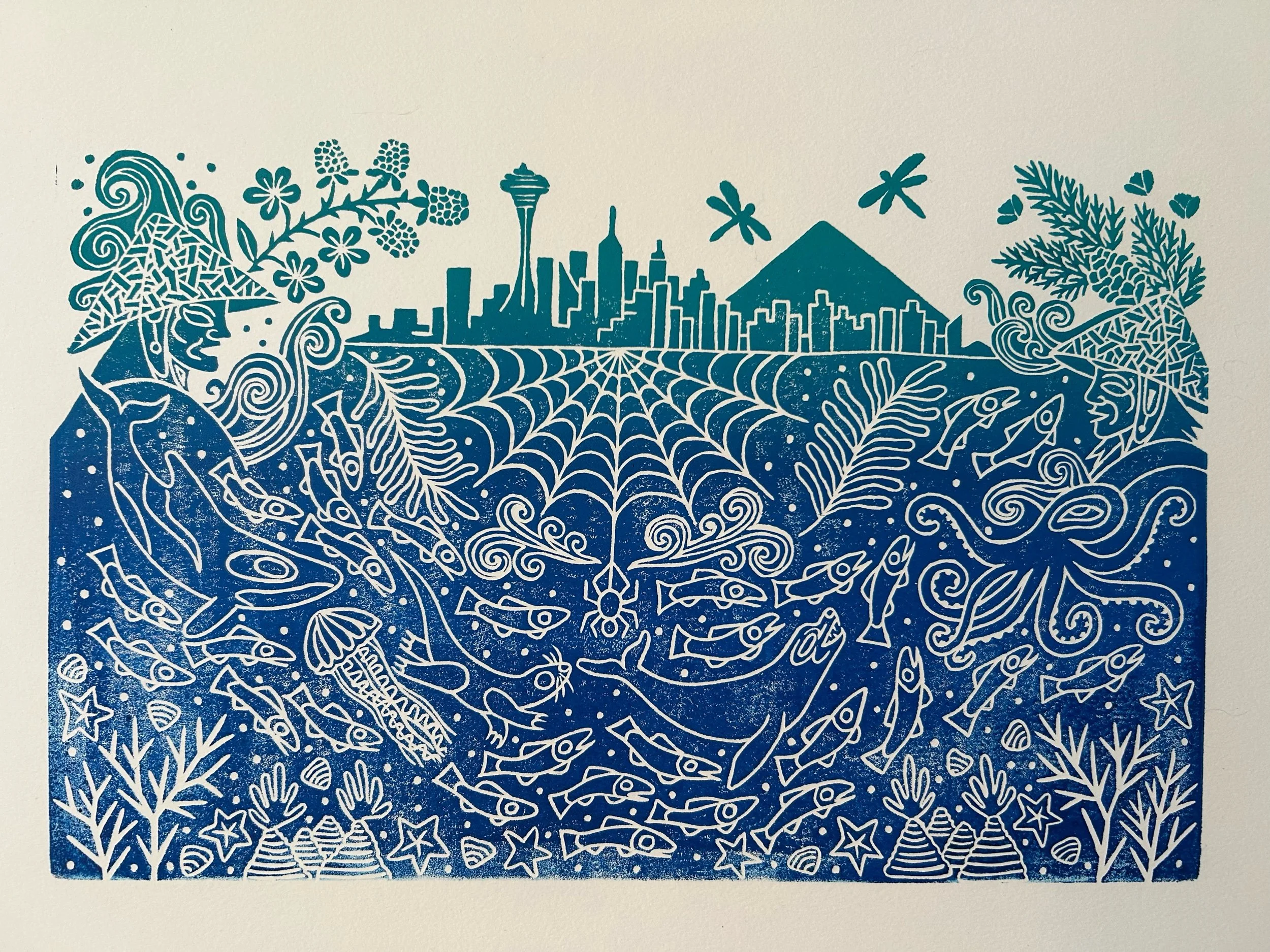 This print features the Seattle skyline, Mt Rainer, two Indigenous people of the Pacific Northwest coast, salmon, a sea lion, a sea otter, and an octopus in the ocean water