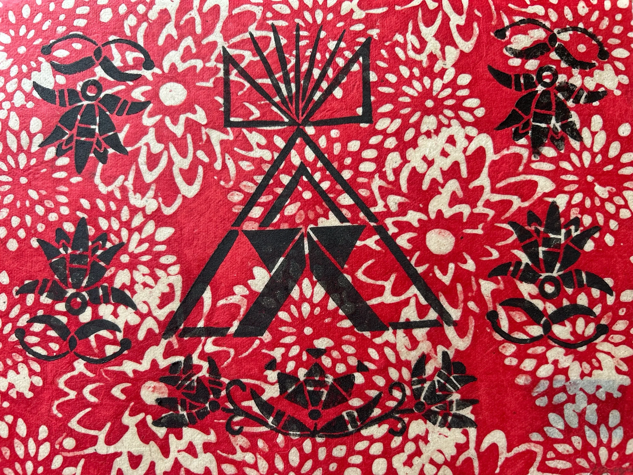 Block printed monotype on red and white floral patterned mulberry paper