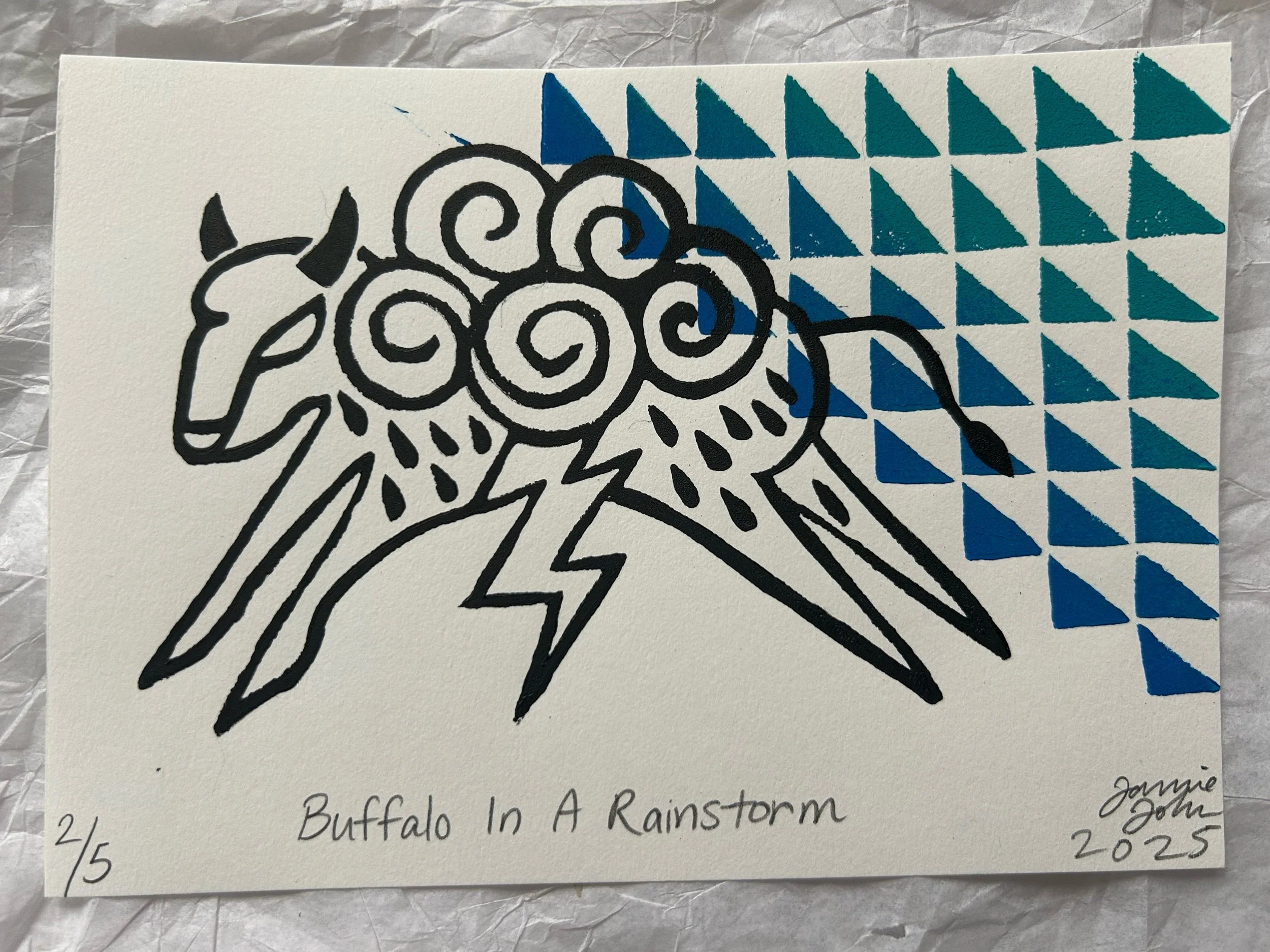 Store › Buffalo In A Rainstorm (out of the storm) Buffalo In A Rainstorm (out of the storm) $11.00 7in by 5in, two layer relief hand pulled print on Strathmore printmaking paper Run of 5, signed and editioned by artist 7in by 5in, two layer relief hand pulled print on Strathmore printmaking paper Run of 5, signed and editioned by artist Quantity: Add To Cart Added!
